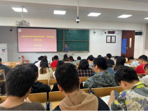 10月15日,前沿交叉学院工程管理系在日新楼D204教室召开了2023届毕业实习动员暨毕业设计培训大会。会议由前沿交叉学院教务办、学工办牵头,系主任熊婷主持。工程管理专业负责人任剑书记、副系主任刘冰、彭翰翔、唐超、李隽永、王倩、欧光照等老师及2023届工程管理专业全体毕业生参加。