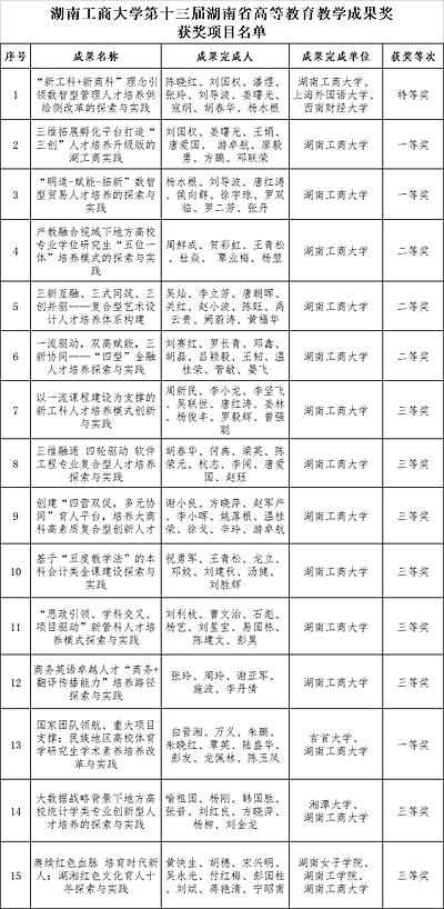 近日,湖南省教育厅发布《关于公布了第十三届湖南省高等教育教学成果奖项目的通知》,中国工程院院士、校党委书记陈晓红牵头的《 “新工科+新商科 ”理念引领数智型管理人才培养供给侧改革的探索与实践》荣获特等奖,此次特等奖是我校首次获得,这也是我校继2018年陈晓红院士牵头的《地方商科院校构建创新创业育人平台的探索与实践》获得高等教育国家级教学成果奖后的又一突破。