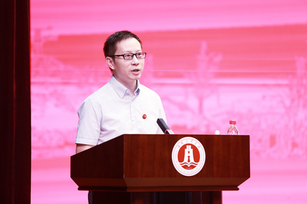 前沿交叉学院梁伟博士作为研究生导师代表发言。他代表学校全体研究生导师向2021级新生表示热烈的欢迎,并祝贺同学们进入求学的新阶段,承担起人生的新使命。他就如何开启科研之路向大家分享了 “八个字 ”:笃行、求真、勤学、强体。笃行,就是要知行合一、学以致用;求真,就是要有批判性思维,勇于探索,敢于挑战;勤学,就是要倾注更多的心血,付出比常人更多的坚韧和勤勉;强体,就是要保持良好的身心健康状态。他希望同学们趁着青春好年华,大展拳脚、有所作为!奔赴自己心中坚定的梦想,在湖工商的热土上留下不负韶华、一生难忘的青春记忆!
