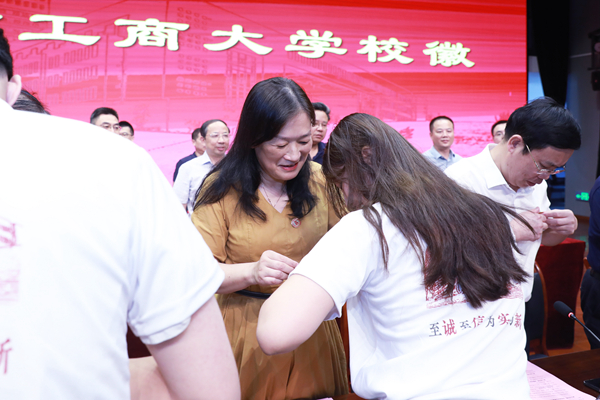 随后,全体校领导、资深教授、党委委员在主席台为研究生新生代表佩戴校徽。其他新生自行佩戴校徽。校徽戴上胸前,是文化的传承、是使命的担当,全体研究生新生将在湖工商新的起点开启新的人生征程。