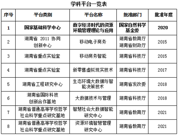 国际国内高端学科平台大量涌现。2019年,与爱尔兰都柏林理工大学共建 “大数据及科技创新中心 ”,省委书记许达哲和驻爱尔兰大使岳晓勇共同为中心揭牌。五年来,新增国家自然科学基金委基础科学中心(中部地区第一个)、生态环境大数据与智能决策技术湖南省工程研究中心、湖南省移动电子商务2011协同创新中心、移动商务智能湖南省重点实验室、新零售虚拟现实技术湖南省重点实验室、湖南省大数据技术与管理国际科技创新合作基地等8个国家级和省级科研平台,建有习近平生态文明思想研究中心等12个研究中心。