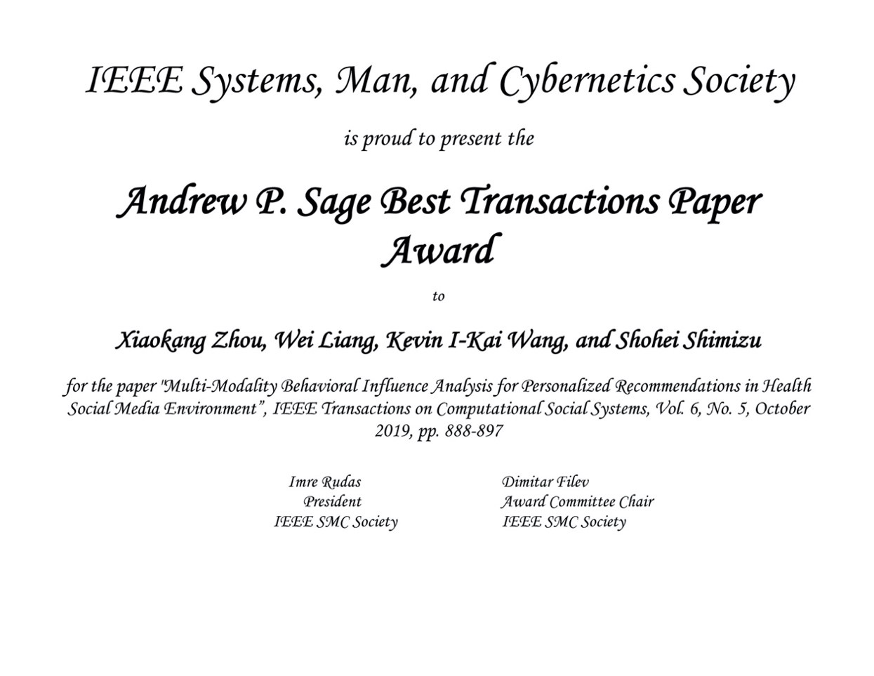 2020年IEEE系统、人与控制论学会(IEEE Systems, Man and Cybernetics (SMC) Society)国际年会在意大利巴里举行,我校大数据与互联网创新研究院梁伟博士(通讯作者)发表的论文 “Multi-Modality Behavioral Influence Analysis for Personalized Recommendations in Health Social Media Environment ” 被授予2020年IEEE SMC学会最佳期刊论文奖(2020 Andrew P. Sage Best Transactions Paper Award)。