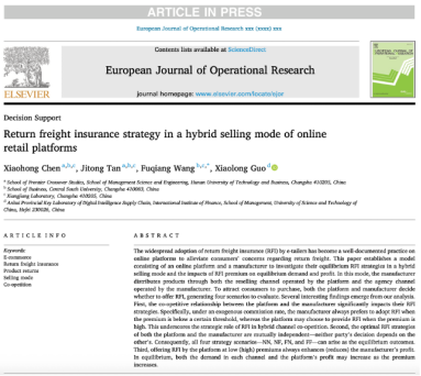 Chen, X., Tan, J., Wang, F., & Guo, X. (2025). Return freight insurance strategy in a hybrid selling mode of online retail platforms. European Journal of Operational Research.